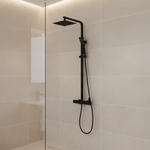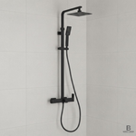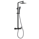 Acabado negro Monomando ducha SKARA. Distribuidor integrado. Barras y soportes a pared de latón. Extensible: 700-1240 mm. Soporte manual de ducha deslizante. Manual de ducha con membrana anti-cal. Rociador cuadrado extraplano de acero inoxidable 25x25...