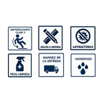 Su superficie imita la textura de la pizarra natural , proporcionando un acabado elegante, antideslizante ( Clase C3 ) y muy fácil de limpiar. Además, su recubrimiento con Gel Coat sanitario aumenta la resistencia frente a impactos, productos químicos y uso intensivo.